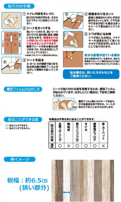 トイレの床の表面を、汚れやキズから守りたい!!そんな願いから生まれた商品です。のりを使用しておりませんので、簡単に貼ってキレイにはがせます。貼りやすいようにシートを4分割してあります。防水ですので、濡れてもサッと拭きとるだけでお手入れラクチン♪ |