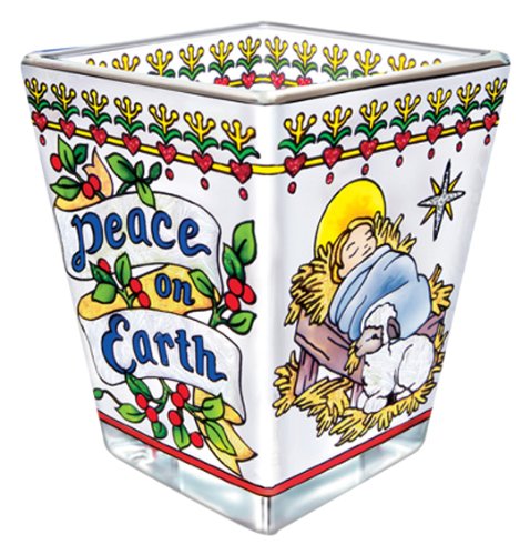 Amia Petite Votive, Hand-Painted Glass with Colorful Peace on Earth Design, 3 Inches Tall