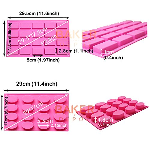 BAKER DEPOT Silicone Mold for Handmad Soap Cake Jelly DIY tools 16 Cavity Oval 20 Cavity Rectangle, Set of 2
