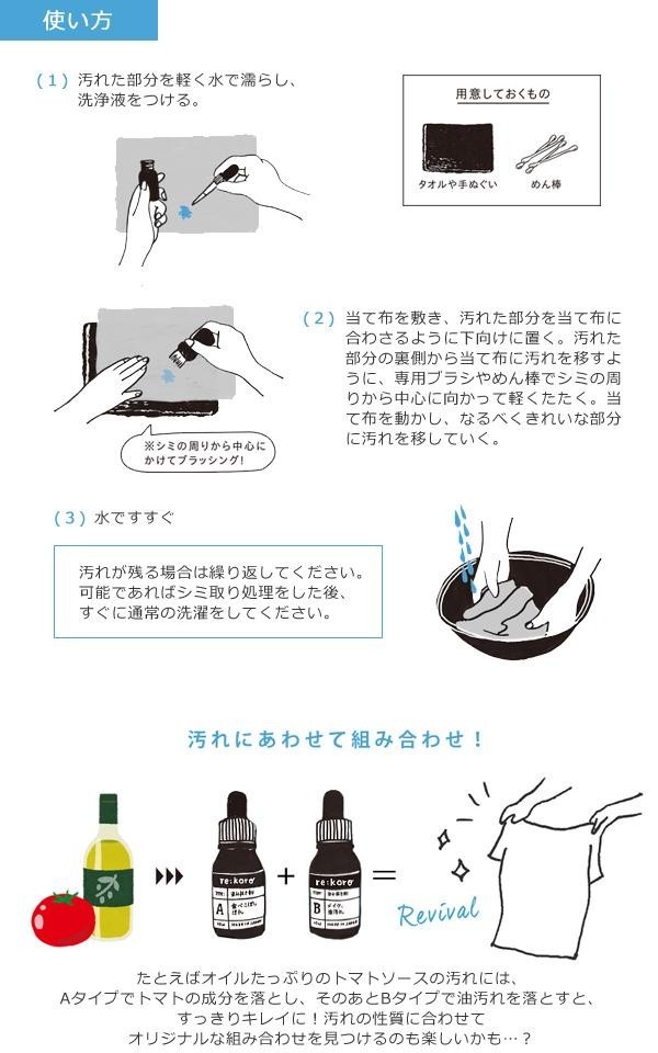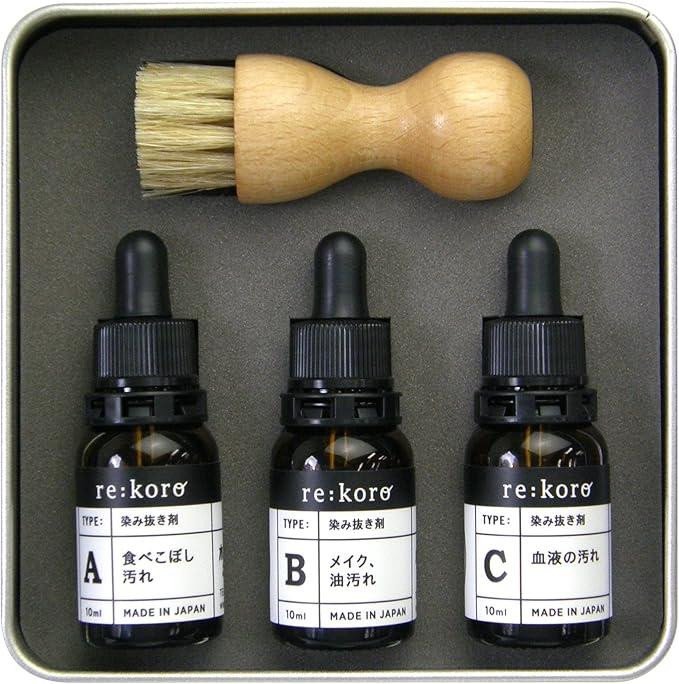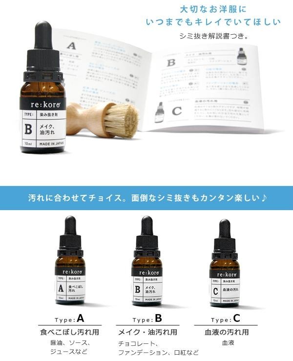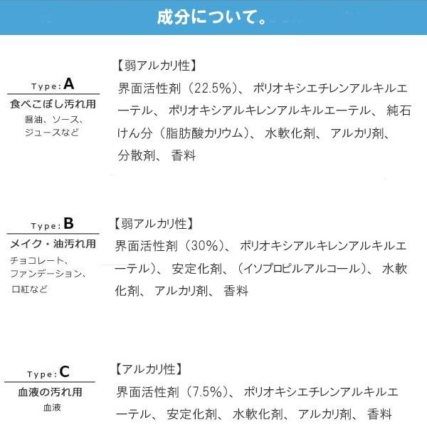 | セット内容 | タイプA:食べこぼし汚れ用(10ml) タイプB:メイク・油汚れ用(10ml) タイプC:血液汚れ用(10ml) ドイツ製専用天然毛ブラシ シミ抜き解説書 |