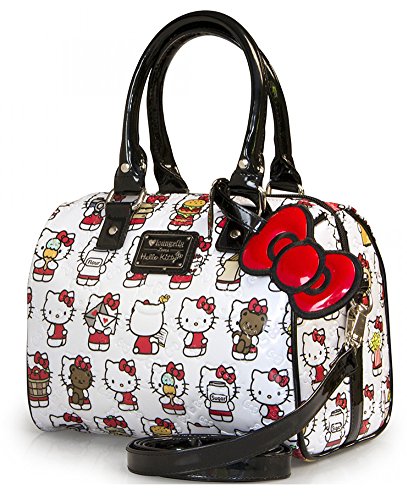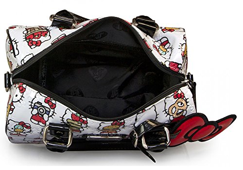 This Hello Kitty purse is perfect for spring and summer! Adorable classic Hello Kitties holding a teddy bear, love letter, ice cream, and apples parade on the front and back of this vegan handbag. Boutique quality handbag with lots of great detailing. The front side has an antiqued silver resin metal label with the authentic Sanrio Hello Kitty and Loungefly logo. Inside contains one large zip pocket and two open side pockets. Fully lined and measures 10 inches wide, 9 inches high, 7 inch depth. 5 inch handle drop. Adjustable and detachable crossbody long straps. Vegan faux-leather.Feature