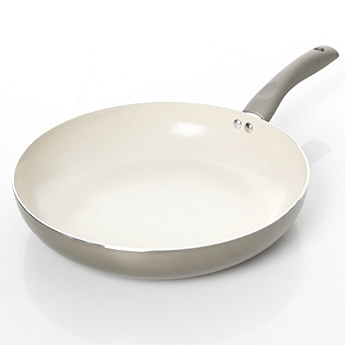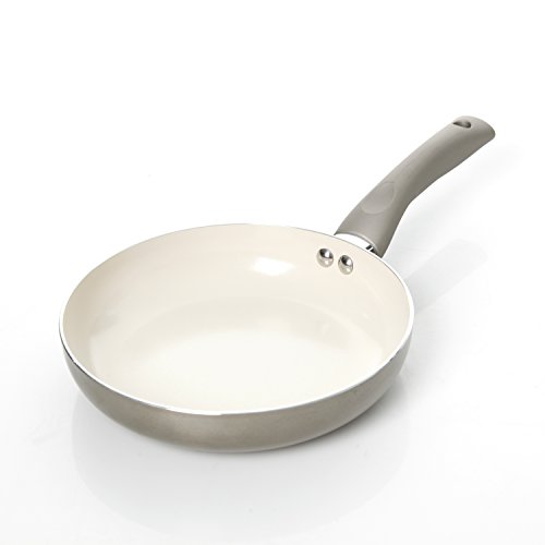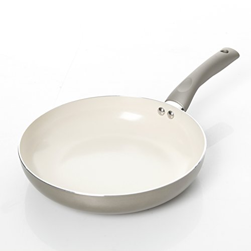 Aluminum fry pan for even heat distribution- Beautiful Champagne Solid Color Exterior for High Heat Resistance - Ergonomic soft grip handles - Ceramic Non-stick interior for low-fat cooking and easy cleanup - Induction Compatible provides the versatility for cooking on any stove, range top or grill.Feature