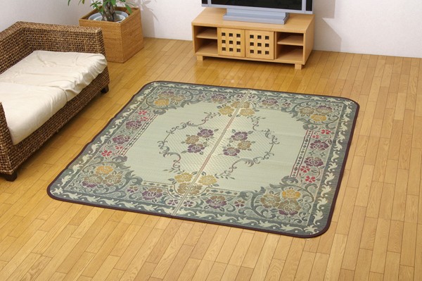 まるで絨毯のようなデザインを施したい草ラグです。い草には空気の自然浄化作用、湿度の調節作用などがあります。また汚れにくく、使用するうちに黄金色に変化し味が出ます。い草に青森ヒバ加工を施しています。(抗菌、防臭効果)フローリングを傷つけにくいよう、裏には不織布を貼っています。