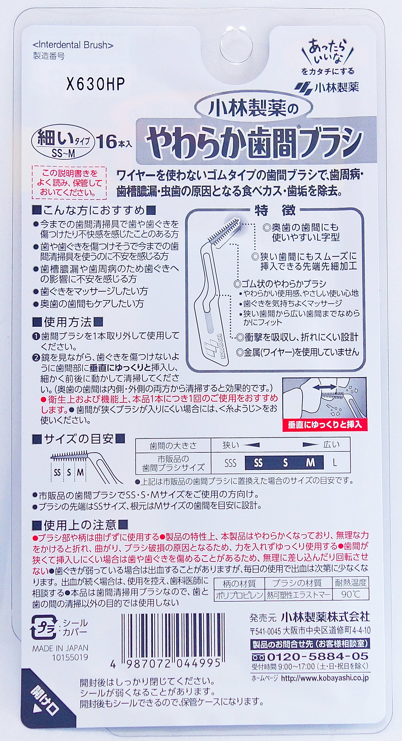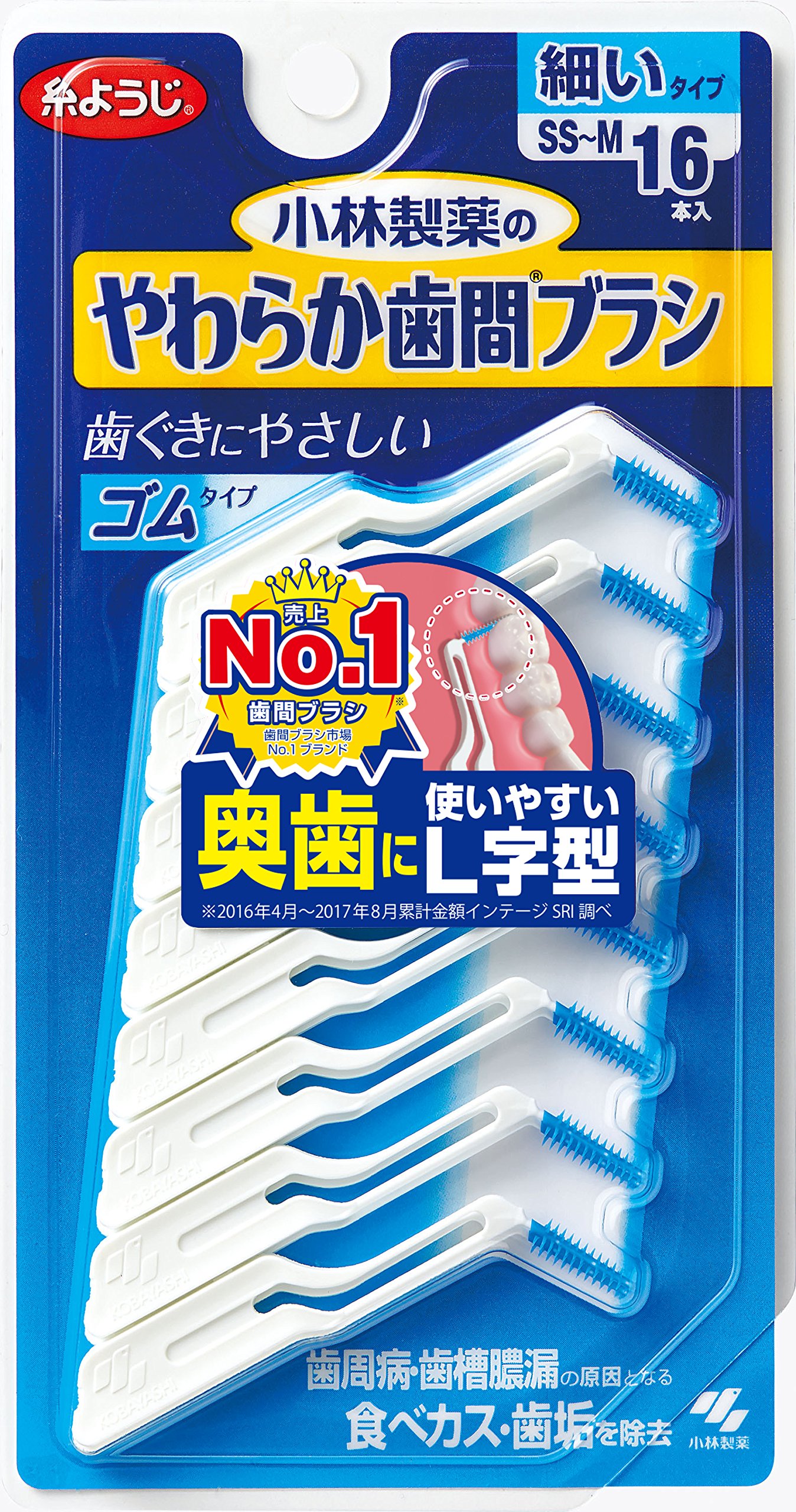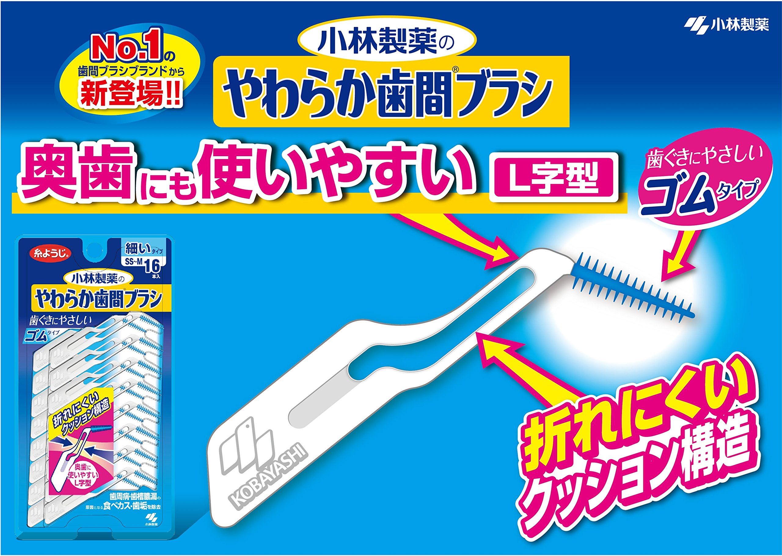 Old product Kobayashi Pharmaceutical's soft interdental brush is also easy to use for back teeth The L-shaped SS-M size is 16 hollow than the rubber type, the handle part becomes hollow, absorbing the force applied to the base of the brush, It became difficult to breaking dramatically. Nevertheless, because it ceases to be seen in a nearby drug store or home center, it is purchased at Amazon. From now on, I will purchase on a regular basis.