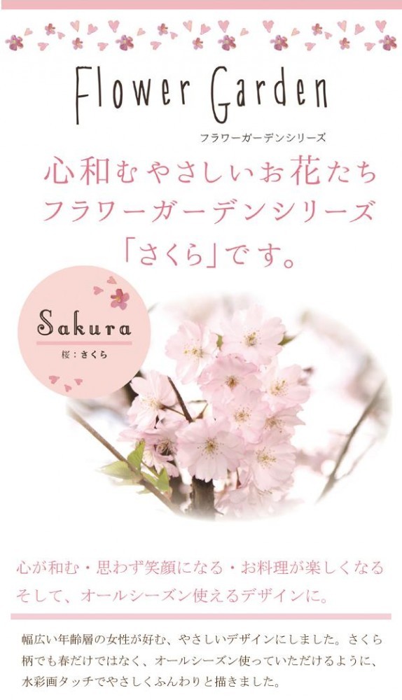 | 幅広い年齢層の女性が好む、やさしいデザインにしました。さくら柄でも春だけではなく、オールシーズン使っていただけるように、水彩画タッチでやさしくふんわりと描きました。 |