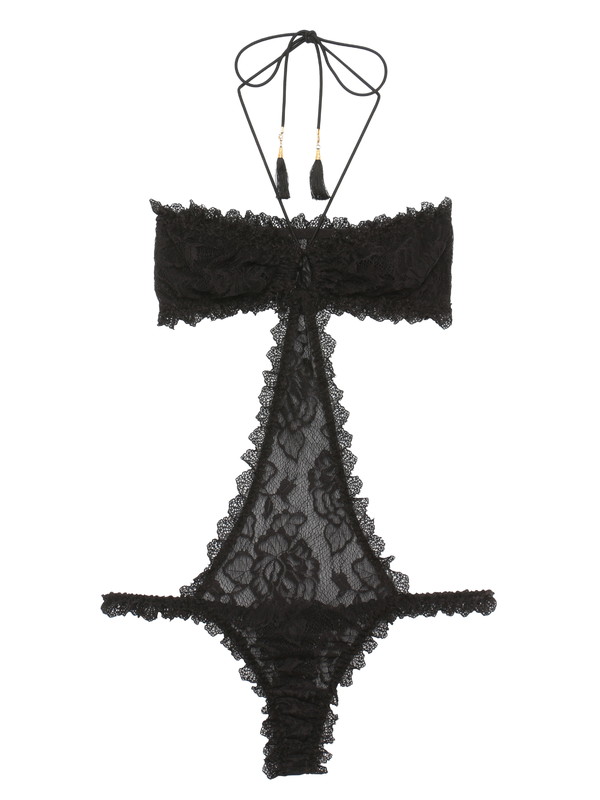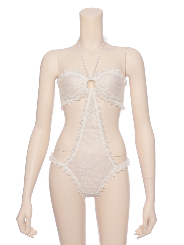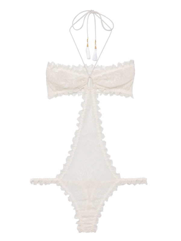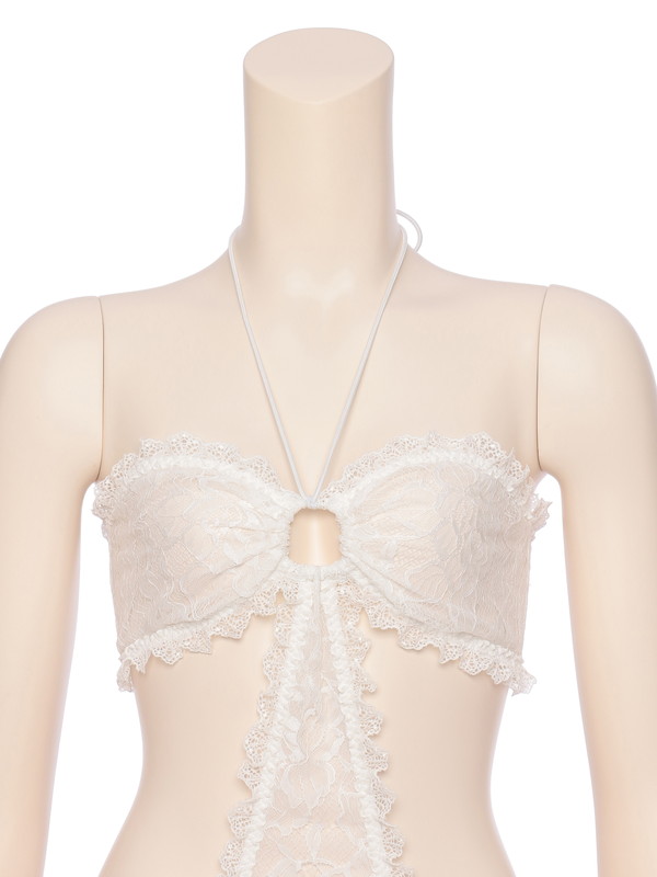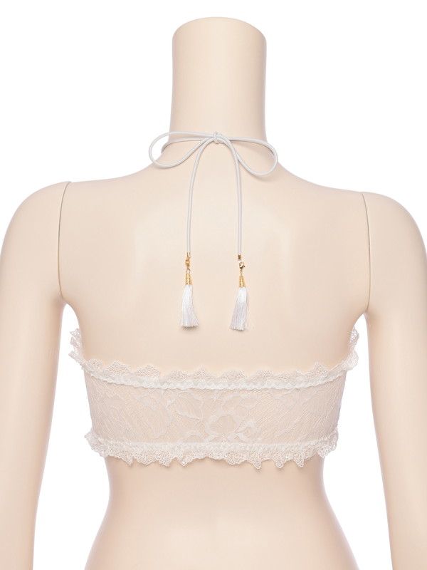 ふわふわとしたリジットレースと、タッセルでアクセントを効かせたホルターネックがロマンティックなデザイン。
