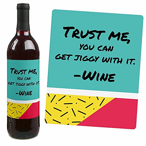 Wine bottle labels have the following sayings on the design: ALL THAT AND A BOTTLE OF WINE, I LOVE THE 90S AND WINE, PAIRS WELL WITH '90S JAMS, TRUST ME, YOU CAN JIGGY WITH IT. - WINE