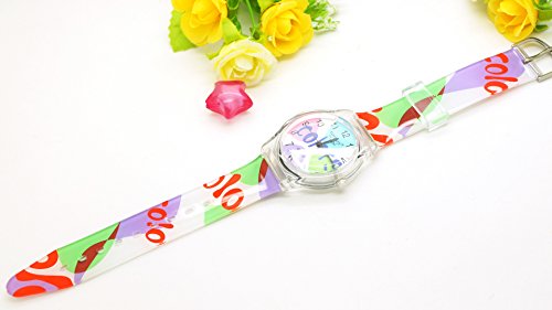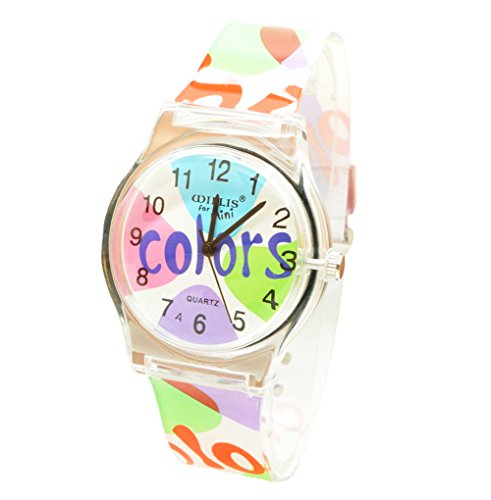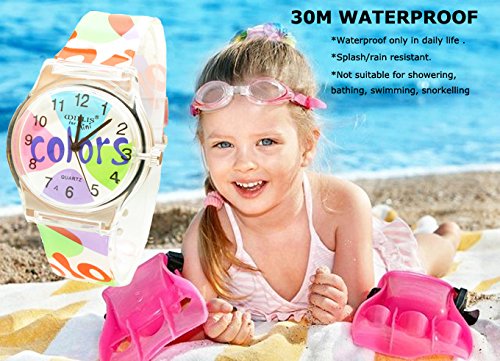 Easy-to-Read Dial with Minutes Marked for Learning.Your kids will love the vibrant purple "colors" watches. High-grade Rohs compliant PVC band,suitable for little wrist from 5.1-7.9 inch. This is a good choice of gift watches for kids. PRODUCT DETAILS: 1.Size & Weight Band length : 23cm / 9.06 in Band width : 1.7cm / 0.67 in Dial diameter : 3.4cm / 1.34 in Case thickness: 0.8cm /0.31 in Maximum wrist band: 20cm / 7.9 in Minimum wrist band: 13cm / 5.1 in Shape of the dial: Round Item weight : 40g / 1.41 oz 2.Material Mirror Surface: Highly Transparent Resin Glass Case material: ABS Caseback material: Stainless steel Strap material: Rohs listed PVC strap Buckle material: Stainless steel NOTE: Waterproof only in daily life .Splash/rain resistant. Not suitable for showering, bathing, swimming, snorkelling, water related work and fishing.Please Don't take this watch to swim or take shower. Avoid to put this watch on Too hot or Too cold place, Too much water contact will shorter this watch's life. Packaging: 1*watch 1*delicate watch boxFeature