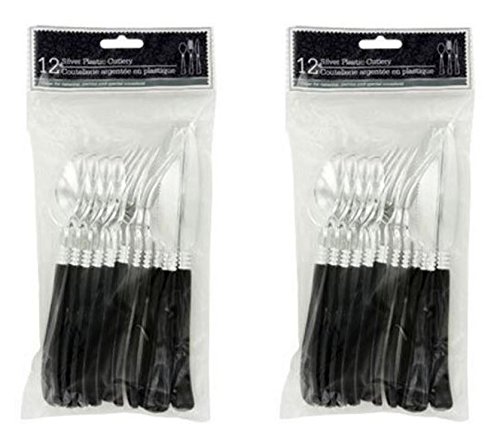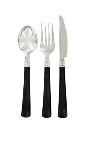 Plastic Flatware - Silver with Black Handles - 8 Place Settings - Cutlery - Disposable