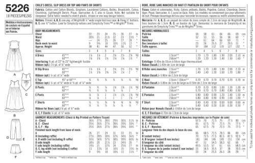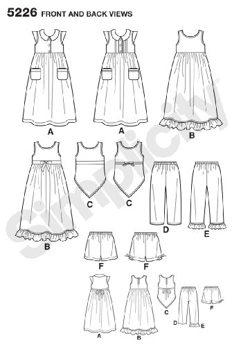 -. Feature : Child dresses in size a (3-4-5-6-7-8) simplicity pattern 5226 / Number of looks included:6 / Instructions are written in english and spanish / Designed and manufactured in the USA / Sested fabrics: cotton and cotton blends, gingham, laundered cottons, batiks, broadcloth, calico, chambray, lightweight denim, pique, seersucker; a, c also in gauze, voile; not suitable for sleepwear