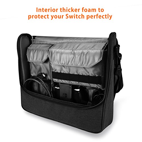 -. Feature : Compatible with Nintendo Switch and accessories like Joycons, Charging Cradle, AC adaptor with Power Cord, Pro Controller, Console and all. / Adjustable shoulder strap & side handle: this user-friendly design makes it more comfortable and convenient to carry around by different ways. / Fitted protective padded design keeps all components secure. / The dimensions of bag is 14.37*11.65*3.62 inches (365*296*92 mm) / 30 days money back, 12 months seller's guarantee and 24 Hours friendly customer service