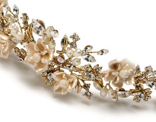 Champagne Flower Tiara is a gorgeous floral tiara that features beautiful gold plating, clusters of creamy freshwater pearls, handcrafted porcelain flowers, and sparkling rhinestones. The ornamented portion of this piece measures 7 1/2 inches long and 1 1/2 inches tall at it's center peak. The tiara has pin loops at both ends to allow you to fasten it easily in your hair with bobby pins. Champagne Flower Tiara coordinates best with off-white and ivory wedding dresses.Feature