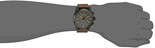 -. Feature : Gunmetal-tone watch featuring three chronograph subdials and date window at four o'clock position / 47 mm stainless steel case with mineral dial window / Swiss quartz movement with analog display / Leather calfskin band with buckle closure / Water resistant to 50 m (165 ft)
