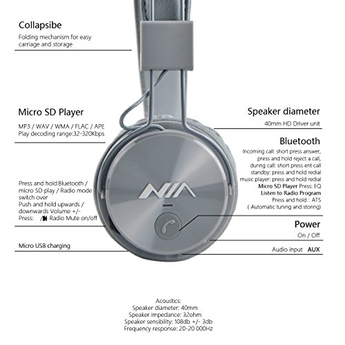 -. Feature : Advanced Technology & High-quality Sound: Bluetooth 4.0 for steady Bluetooth signal to support connecting devices over 33 feet away; Rich and textured Sound as well as powerful Bass reproduced by 40mm dynamic driver / Long Battery Life & Dual Mode: Up to 8-12 hours of music time, with a cable it can be a wired headphone without battery consumption / Function 4-in-1: Bluetooth stereo,TF card play,FM Stereo Radio and Audio input 4-in-1 headphones will be your best companion for music, movie and games / Portability and flexibility ensured by foldable compact design, 90-degree ear cups, softly padded headband and protein earmuff for long-term wearing comfort. (The package excludes Interchangeable cables) / Compatiable with all Android phones, IOS, winphone and Blackberry system phones, convenient to End/Answer phone calls, Pause/Play music, switch of previous/next songs
