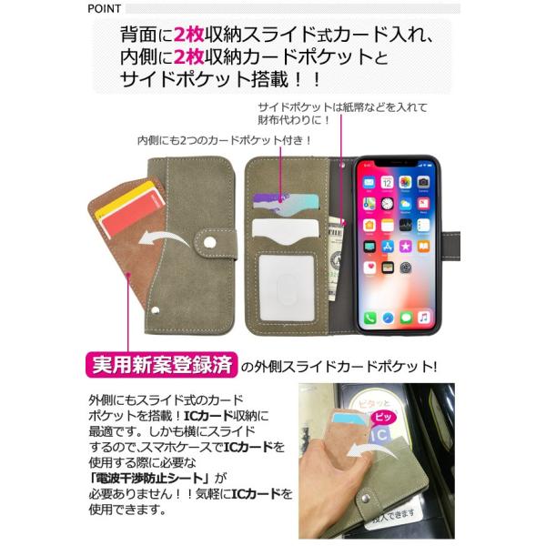 | 商品の説明 | 背面に2枚収納スライド式カード入れ、内側に2枚収納カードポケットとサイドポケット搭載した、 iPhone用スライドカードポケットソフトレザーケース 対応機種 iPhoneX iPhone8 iPhone7 iPhone8Plus iPhone7Plus 背面にもスライド式のカードポケットを搭載! (実用新案登録済) ICカード収納に最適です。 しかも横にスライドするので、スマホケースでICカードを使用する際に必要な 「電波干渉防止シート」が必要ありません! 気軽にICカードを使用できます。 滑らかな手触りソフトレザーデザイン。 持つ度に手にしっくりと馴染みます。 背面を折り返すとスタンドとして使用できるので、動画視聴に便利です。 落下防止に便利なストラップホール付きです。 横開きタイプなので、手帳のように使うことができます。 しっかりと固定できるスナップボタン式を採用! マグネットタイプではないので クレジットカードなどの磁気カードも収納できます。 ※iPhoneは付属しません。 ※ライセンス商品ではありません。 |