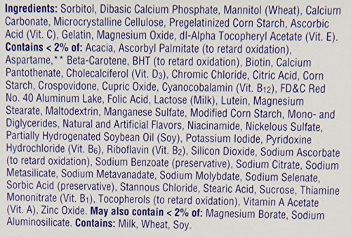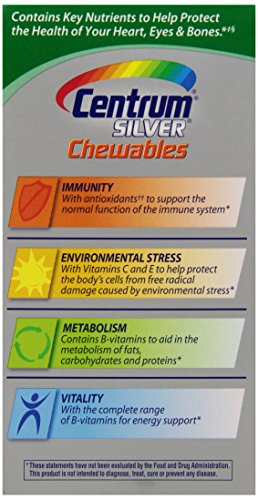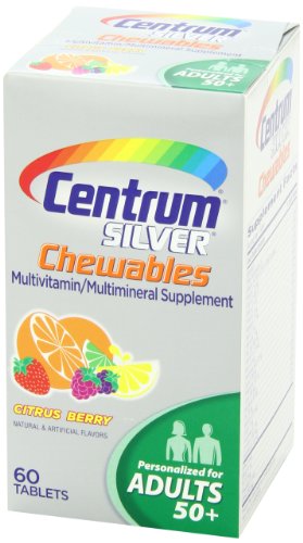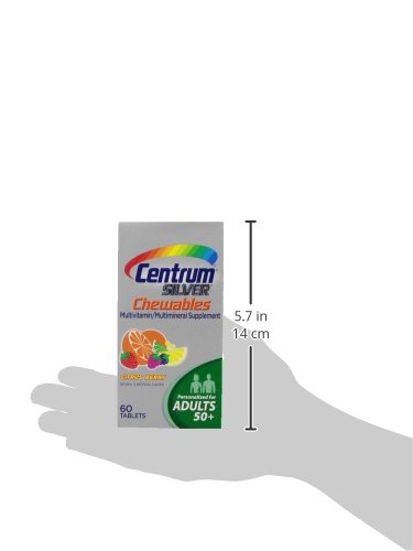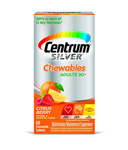 -. Binding : Health and Beauty -. Brand : Centrum -. Feature : Pack of three, 60 counts (total of 180 counts) / Age-adjusted multivitamin for people over 50 years / Helps protect health of heart, eyes and bones / Specially formulated with certain age-essential nutrients like Calcium, B Vitamins and antioxidants -. IsAdultProduct : 0 -. Label : Centrum Silver -. Manufacturer : Centrum Silver -. NumberOfItems : 3 -. PackageQuantity : 3 -. ProductGroup : Health and Beauty -. ProductTypeName : HEALTH_PERSONAL_CARE -. Publisher : Centrum Silver -. Studio : Centrum Silver -. Title : Centrum Silver Multivitamin/Multimineral Supplement Chewable Tablets for Adults 50+, Citrus Berry, 60 Count Bottles (Pack of 3) -. UPC : 300054461193