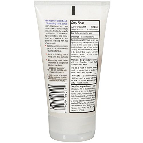 Neutrogena Blackhead Eliminating Daily Scrub clears blackheads and helps prevent new ones to give you clear, smooth skin. Its powerful combination of blackhead fighting medicine and microbeads works together to clean pores and help keep them free of blackheads: Salicylic acid penetrates into pores to remove blackhead causing dirt and oil, gentle exfoliating beads sweep away dead skin cells, skin soothing beads deliver conditioners to help prevent skin from overdrying.Feature
