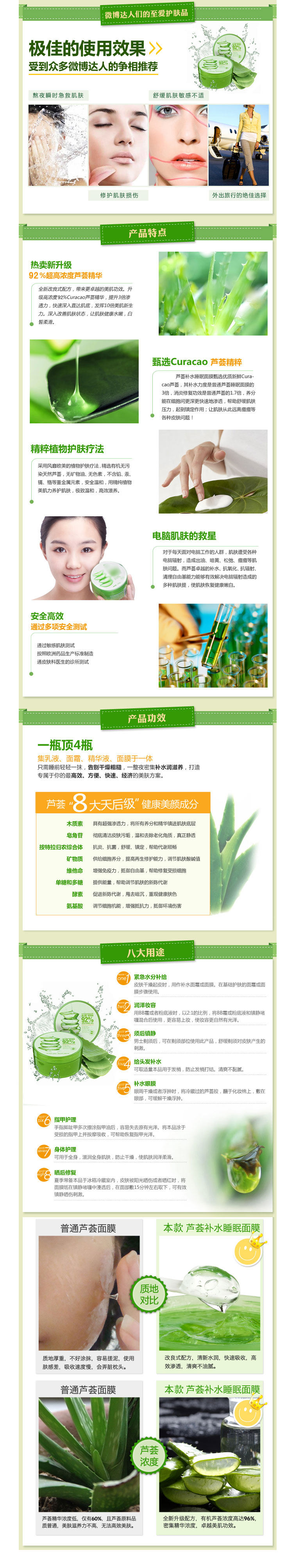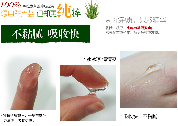 8 after sun repair: Summer standing of the product in the refrigerating chamber of the refrigerator, the skin is the sun or sun red, the mask of paper soaked in sedation in the gel, facial deposited about 15 minutesremove, which can effectively calm sunburn irritation. (can not apply paper mask, apply a thick layer on the face, keep for 15 minutes or so, absorptioncan not fully gel wipe)