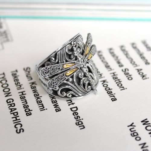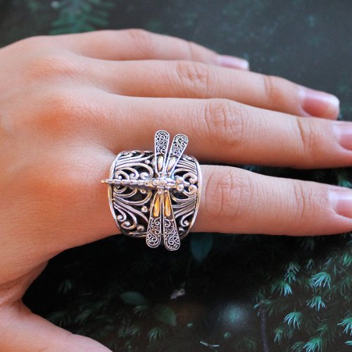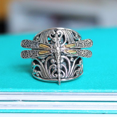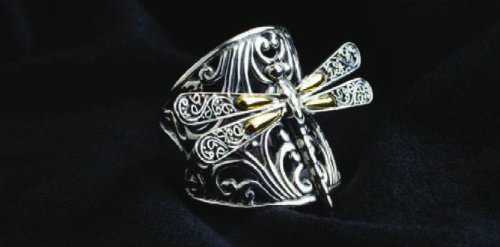 - Feature : Ring is made of solid 18k yellow gold and sterling silver, has solid quality and is part of the famous Dragonfly Collection which received "Jeweler's choice" award. / Ring is available in sizes: 7, 8, 9. Width: 1 inch. / Comes with a gift box, free shipping and 30-day no-questions-asked return policy.