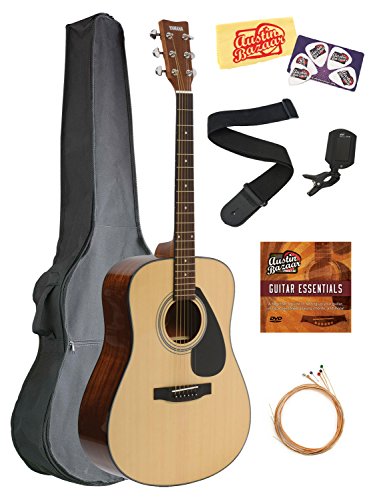 The number one brand for students, Yamaha acoustic guitars are perfect for beginners. Yamaha acoustic guitars are manufactured with high standards of quality, unlike the many generic instruments cluttering the marketplace today. They offer a pleasant learning experience, not just in terms of their acoustic qualities but also in terms of playability. This particular bundle includes the Yamaha F325 Dreadnought Acoustic Guitar, which boasts a spruce top, rosewood fretboard, and chrome tuners. The bundle also includes a hardshell case, clip-on tuner, strap, extra strings, Austin Bazaar instructional DVD, picks, and polishing cloth. These are all essential accessories for acoustic guitar, so save yourself the additional shopping and get everything you need in one package. This bundle includes everything you need to start playing right out of the box.Specifications