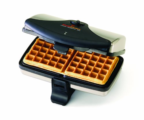 This elegant new waffle maker bakes two delicious waffles in just two minutes or less. Enjoy the fresh taste and delicious aroma of these perfect homemade waffles that will delight the most discerning palates from children to adults. Ideal for homemade or quick mix batters, the WafflePro M852 features a superior non-stick easy release coating and consistent even heating that guarantees beautiful waffles uniformly cooked inside and out for the perfect tasty treat. It quickly recovers its temperature so it's always ready to bake and feed even the biggest of appetites. The top waffle plate is attached with a floating hinge to ensure uniform thickness and even baking. A convenient, easy open latching handle combined with a built-in cord storage compartment allows this waffle maker to be efficiently stored in a space-saving upright position.Feature