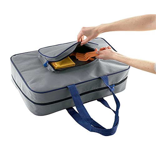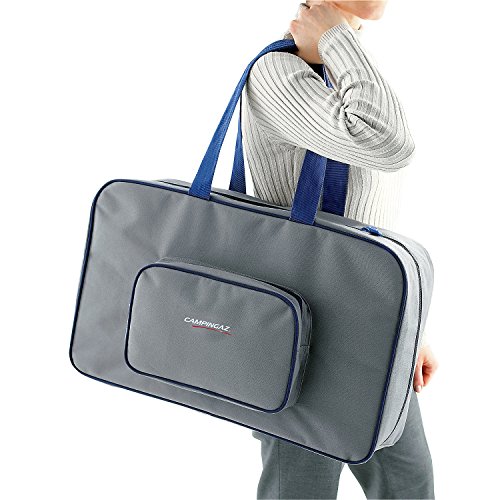 Bei manchen Dingen fragt man sich, warum es die nicht schon längstens gibt. So auch bei dieser Transporttasche für 2-Flammkocher, die das Problem der geschützten Lagerung oder des Gerätetransports endlich ganz unkompliziert und mit viel Komfort lösen · Transporttasche für 2-Flammkocher · Material: Polyester 600 D mit PVC-Beschichtung · 1 Fronttasche für Zubehör · 2 verstärkte Schulterriemen für guten Tragekomfort · Großer, leichtgängiger Reißverschluss gewährt guten Zugang zum Gerät · Maße (L x B x ): 57 x 35 x 14 cm · Farbe: grau/blauFeature