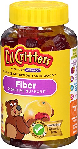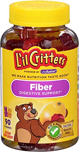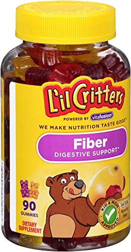 L'il Critters Fiber Gummy Bears are a fun and tasty way to help kids get their needed fiber. One gummy serving provides as much fiber as 5 prunes. Fiber is important because it has an influence on the digestion process from start to finish. Fiber slows digestion and absorption so that glucose (sugar) in food enters the bloodstream more slowly, which keeps blood sugar on a more even level. Fiber is also broken down in the colon and the simple organic acids produced by this breakdown help to nourish the lining of the colon. These acids also provide fuel for the rest of the body, especially the liver, and may have an important role in metabolism. The 3 grams of fiber per serving in L'il Critters Fiber Gummies provides probiotic digestive support.* L'il Critters Fiber Gummies contain naturally sourced colors and flavors and are sugar and gluten free. They contain no wheat, milk, eggs, peanuts, tree nuts, shellfish or soy. Serving size 2 L'il Critters Fiber Gummy Bears per day for each child two years old or older. Bottle contains 90 Gummies - 45 servings for a child 2 years old or older. Not recommended for children under 2. (*These statements have not been evaluated by the Food and Drug Administration. This product is not intended to diagnose, treat, cure or prevent an disease.) The Gluten Free statement on product labels were removed to prioritize different product claims. Neither the process nor the formula have changed in regards to gluten. All products are labeled as required by federal labeling regulations and use quality ingredients to make our gummy vitamins nutritious and great tasting.Feature