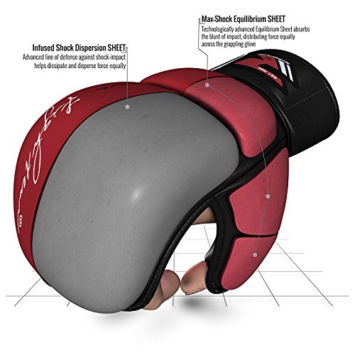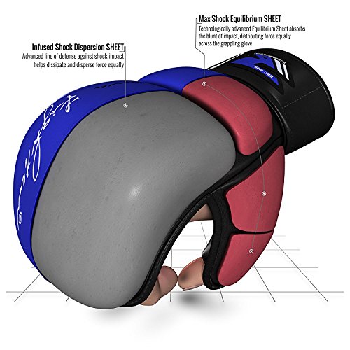 -. Feature : Resilient Maya Hide leather construction makes these MMA gloves stubbornly durable and long-lasting / Super dense impact resistant multi-layer gel integrated Padding over knuckle-side and added block padding over wrist. / Quick-EZ Velcro closure with extra-long strap provides enhanced wrist-support and a snug fit / Advanced inner-lining and moisture wicking microfabric expels moisture away from skin to provide ventilation and prevent odour causing bacteria from thriving / Palm-O design provides better grip coupled with special thumb-enclosure for maximum protection