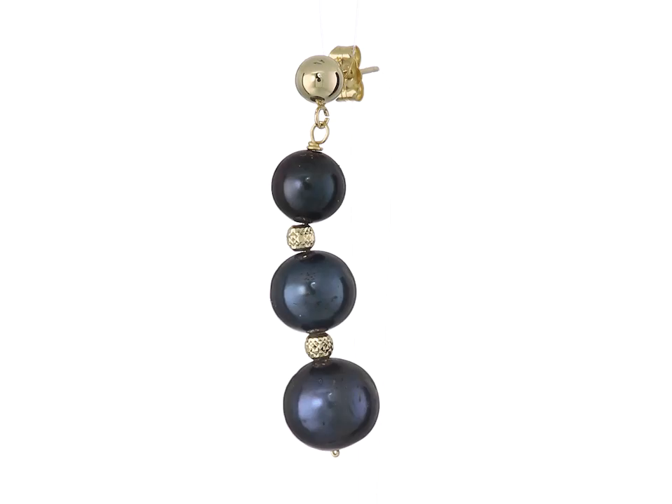 14k Yellow Gold Graduated 6.5-9.5mm Black Freshwater Cultured Pearl with Sparkling Beads Dangle Earrings