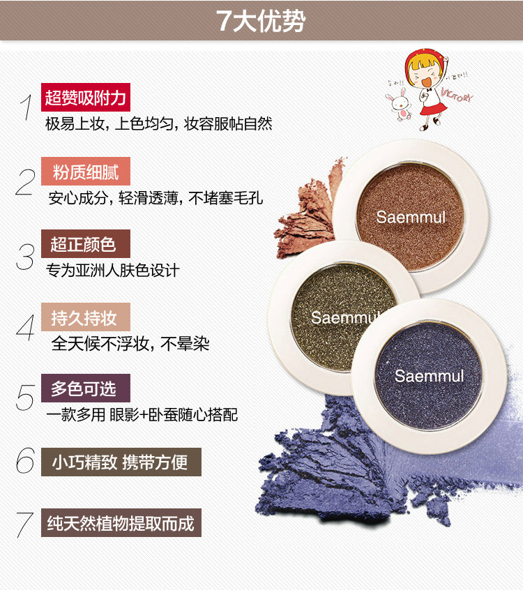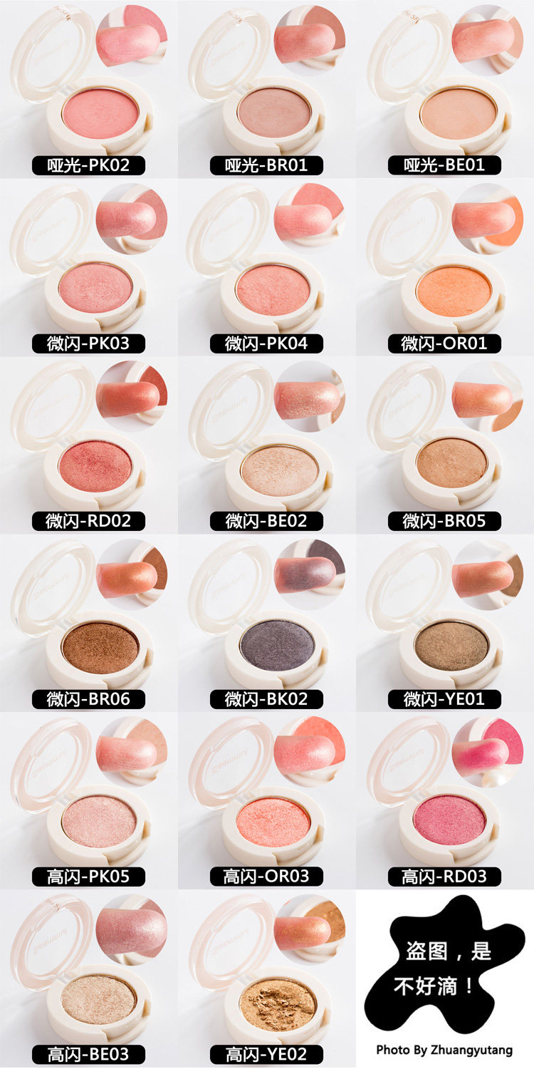 | 将众人的目光聚焦在我的眼睛~! 可以根据 不同的需要搭配,同色系一起使用可以简单的打造渐变效果,可爱、清纯、性感、知性、干练,百变造型随心搭配。粉质细腻,易上色,贴妆度高,不易脱妆。 多色可选,咖色系,粉色系,橘色系,黄色系,单色而不单调,绚丽多彩,可根据自身肤色选择,随意搭配,不再受眼影盘限制,需要什么色可以随时单色购买。 【1】哑光:眼影质地,营造阴影感,适合眼部打底,局部显色; 【2】微闪:珠光微细而闪亮的珠光,让眼睛更有神,多角度的散发光彩; 【3】高闪:钻石闪亮,时尚气息十足!适合局部高光提亮。 | |||||||||