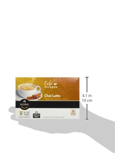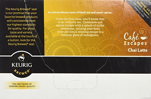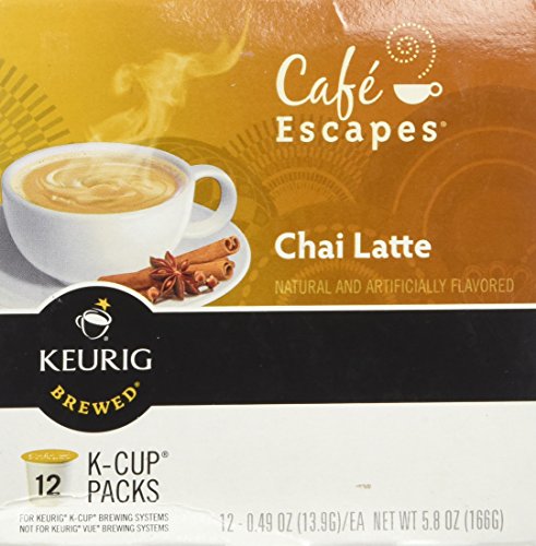 -. Binding : Grocery -. Brand : Café Escapes -. EAN : 0099555098051 -. Feature : Tasting notes: an extraordinary taste of black tea and exotic spices / Product details: each serving is less than 100 calories / enjoy a little decadence from your Keurig brewer / Keurig quality: if it doesn't have the Keurig logo / it's not Keurig quality. In order for your Keurig brewer to give you the best beverage possible / be sure to use only Keurig k-cup packs -. Label : GMCR - 72ct -. Manufacturer : GMCR - 72ct -. PackageQuantity : 1 -. ProductGroup : Pantry -. ProductTypeName : GROCERY -. Publisher : GMCR - 72ct -. Studio : GMCR - 72ct -. Title : Café Escapes Chai Latte Keurig K-Cups Coffee, 12 Count -. UPC : 099555098051