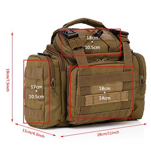 Size:11x7.5x4.3inch; Main compartment:8.6x6.6x4.1inch; Top compartments:7x3.9x1.1cm; Front compartments:7x5.5x1.5inch; Two side pockets:6.6x4.1x1.5inch; Many inner pockets.
