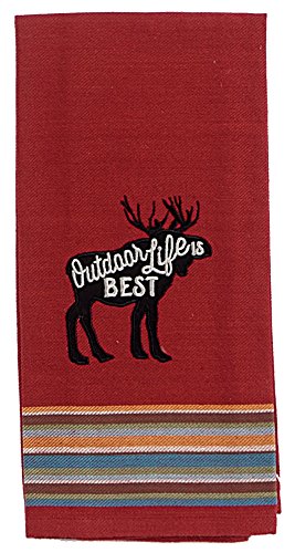 - Cotton tea towel features a moose applique and outdoor life is best embroidery detailing