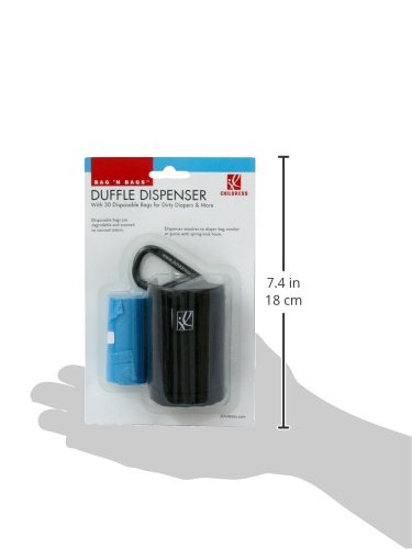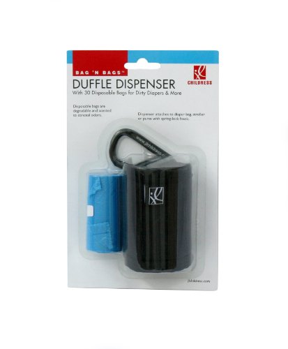 Be prepared for messes wherever you are with the J.L. Childress Bag 'N Bags duffle dispenser. This fabric duffle-style dispenser conveniently holds 1 roll of disposable bags and features a velcro opening to easily replace rolls. Unlike plastic dispensers, the Bag 'N Bags won't crack and break. A metal spring-lock hook stylishly attaches the dispenser to your diaper bag, stroller or purse, keeping bags easily accessible at all times. The Bag 'N Bags comes with two 15-bag rolls of large disposable bags with easy-tie handles. The disposable bags are lightly scented to conceal odors and are degradable. The Bag 'N Bags is perfect for containing dirty diapers and bibs, soiled clothing, food and wet items. Plus, the stylish black color coordinates with your diaper bag or purse. No more searching for bags or worrying about odors, the Bag 'N Bags takes care of it all. Also look for our Tie 'N Toss replacement disposable bags.