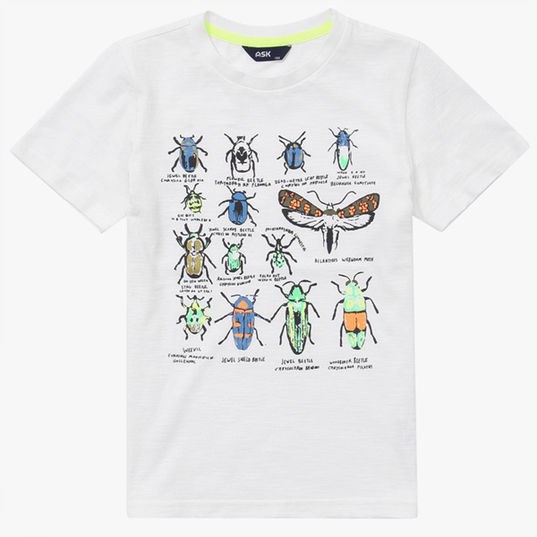 ●상품설명- 얇고 부드러운 면슬랍원단에 아이들이 좋아하는 곤충프린트의 네온 포인트 컬러로 포인트를 준 반팔 라운드 티셔츠.