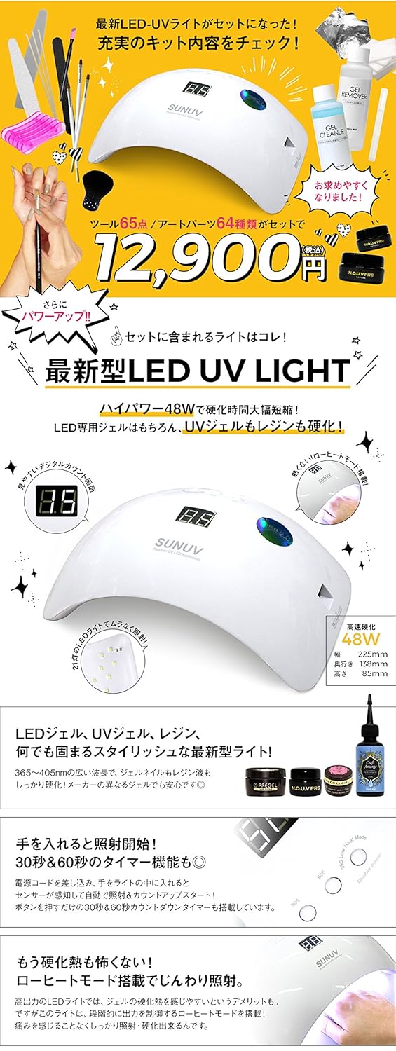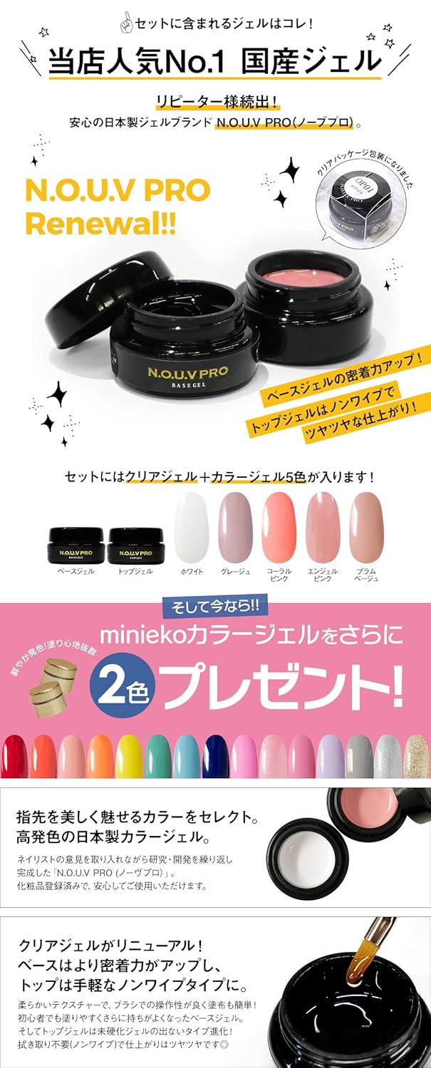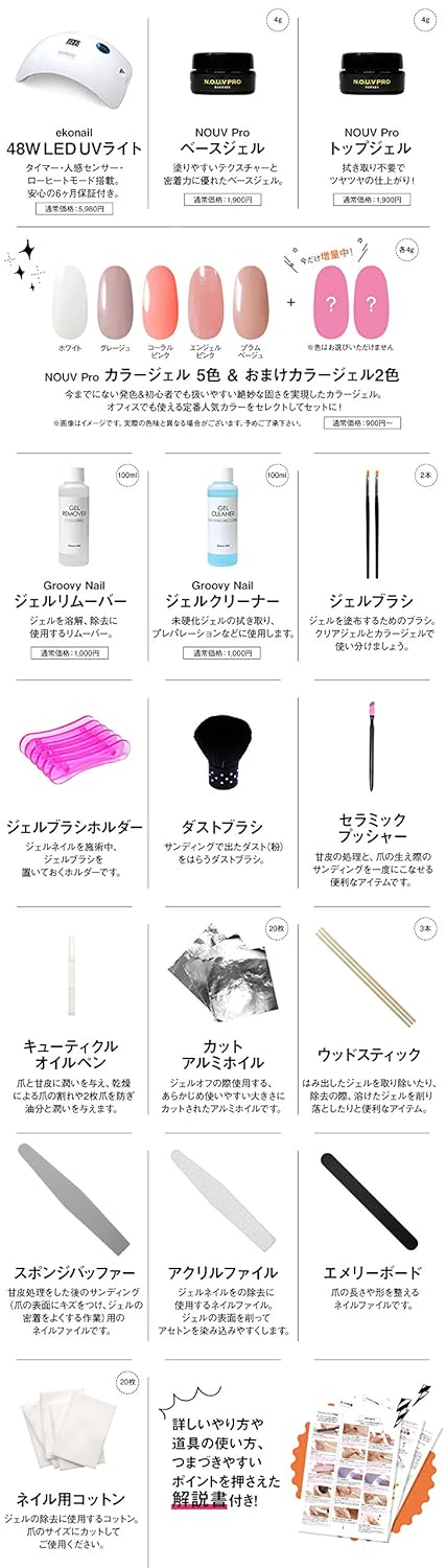 - 【セット内容】 ●ドーム型LEDUVライト 48W 自動センサー/タイマー/ローヒートモード機能付き ●NOUV Pro ベースジェル 4g ●NOUV Pro ノンワイプトップジェル4g ●NOUV カラージェル 4g (ホワイト/グレージュ/コーラルピンク/エンジェルピンク/プラムベージュ&スタッフセレクト2色) ●ジェルリムーバー 100ml ●ジェルクレンザー 100ml ●ジェルブラシ 2本 ●キューティクルオイルペン 5ml ●ダストブラシ (カラーは選べません) ●ブラシホルダー ●セラミックプッシャー ●ネイルコットン 20枚 ●アルミホイル 20枚 ●スポンジバッファー ●エメリーボード ●ネイルファイル ●ウッドスティック 3本 ●初心者でもわかりやすい「ジェルネイル解説書」付き 【アートパーツ 64種類】 ○パールストーン(ホワイト4種)、スタッズ(リーフ/スティック/ドーム他)、ブリオン(ゴールド/シルバー/ローズ)、ラインストーンなど合計64種類 ※購入から6ヶ月保証付