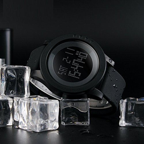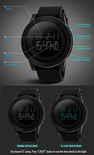 -. Feature : WATERPROOF: 164 ft waterproof (50 M) - 5ATM water resistant. NOTE: please DO NOT press any buttons in the water. / DUAL TIME SUPPORT TWO TIME ZONE, 12 / 24-hour mode operation (Week Day is automatically calculated according to Year- Month-Date Setting) / SIMPLE BLACK DESIGN: shock resistant, super easy to read, stop watch, military 12H/24H time, and LED back light functions make it perfect for all kind of sports and daily use. / Multifunction Watch: Calendar Month / Day / Date, Alarm, Dual Time, Water Resistant, LED Display, Back Light, Shock Resistant, Stop Watch. / COMFORT with FASHION: silicone rubber watch band with the simplicity slim design make it comfortable to wear and lead you to sport fashion edge. Perfect for both indoor and outdoor activities.