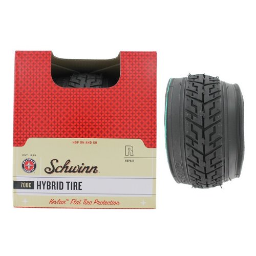 Amazon.com The Schwinn 700c Comfort/Hybrid Tire with Kevlar offers a mixed terrain traction pattern to keep your wheels turning smoothly on the road, while providing extra traction when you hit the trail. Built for durability and to reduce the risk of flats, the tire offers durable, steel bead construction with a built-in flat resistant layer for greater protection on and off the road. Ideal for comfort and hybrid bikes, the tire fits 700c wheels and measures 38-millimeters in width. 0