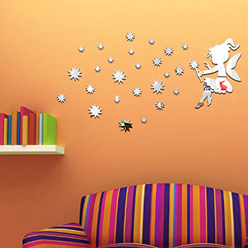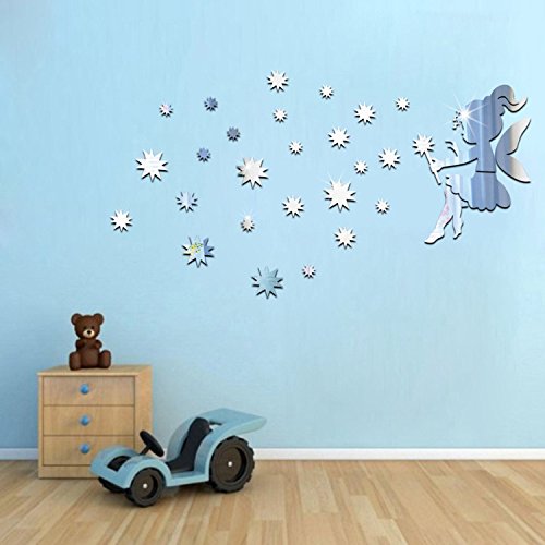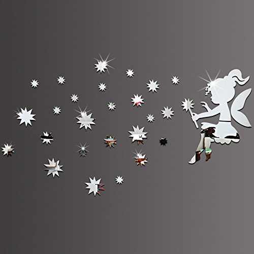 Cute Little Fairy Stars DIY Wall Decor Art 3D DIY Acrylic Mirror Wall Sticker for Kids Room Bedroom Kindergarten Wall Decals Stickers Wallpaper Home Decoration (Silver)