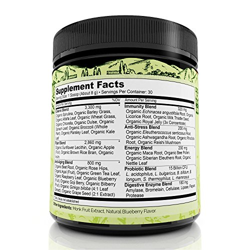 ★ ORGANIC INGREDIENTS: Organic Spirulina, Barley Grass, Alfalfa, Wheat Grass, Chlorella, Acai, Goji Berries, Kale, Spinach, Broccoli, and 26 Other Organic Plant Extracts