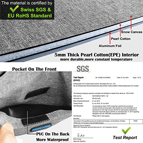 High density snow canvas + 5mm Pearl cotton+nontoxic aluminum foil.Highly stitched to ensure LASTING STRENGTH not tear easily,nontoxic aluminum foil is Eco-friendly and food safe, Leak resistant liner, easy to clean.