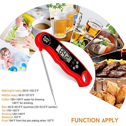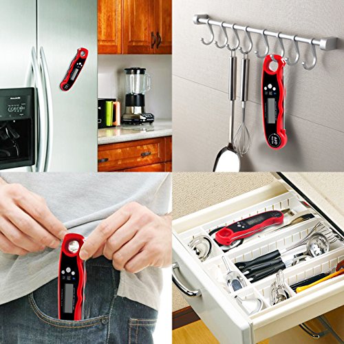 - 【Powerful Magnetic Function】This food thermometer is built in strong magnet.Allow to hang on Refrigerator Door, Barbecue Rack, Cupboard, or any iron surface.Easy to carry and store in your kitchen drawer Perfect for Kitchen, Outdoor Cooking, BBQ, Liquid, Food, Meat, Candy, Coffee, Milk and Bath water temperature.