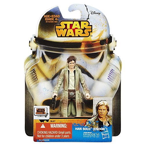 -. Binding : Toy -. Brand : Star Wars -. Color : Brown, Tan, Black -. Department : Boys -. EAN : 0630509283620 -. Feature : Detailed figure looks like Han Solo / Includes blaster accessory / Re-create your favorite Star Wars battles or create brand new ones / Stand him up in your collection / SL27 Han Solo -. IsAdultProduct : 0 -. Label : Hasbro -. LegalDisclaimer : WARNING! CHOKING HAZARD! Small Parts. Not for children under age 3. -. Manufacturer : Hasbro -. Model : B1113AS0 -. MPN : B1113AS0 -. PackageQuantity : 1 -. PartNumber : B1113AS0 -. ProductGroup : Toy -. ProductTypeName : TOYS_AND_GAMES -. Publisher : Hasbro -. Size : Approx 3 1/2" H -. Studio : Hasbro -. Title : Star Wars Saga Legends Han Solo (Endor) Figure -. UPC : 630509283620 -. Warranty : No Warranty
