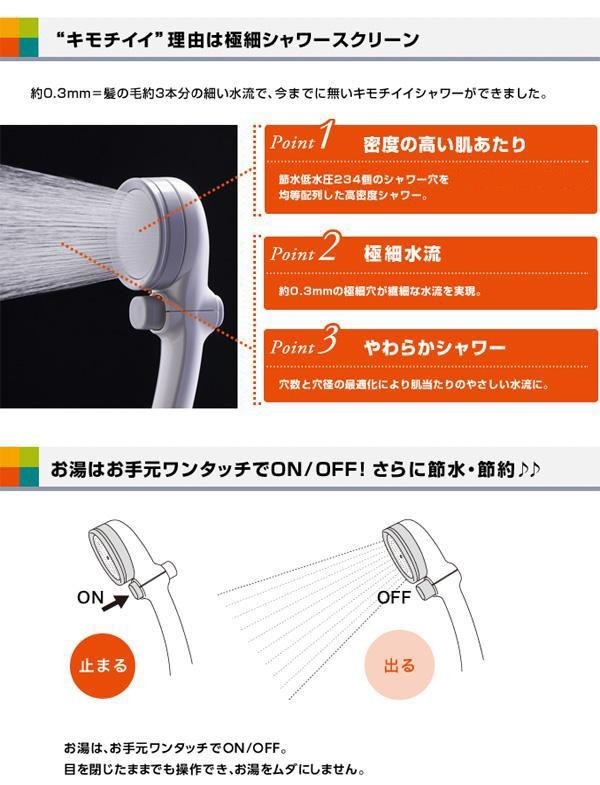 極細水流が気持ちいい!優しい肌あたりはそのままに、節水タイプながら水の勢いは十分。お湯をムダにしない手元止水機能「シャワピタ」つき。 |
