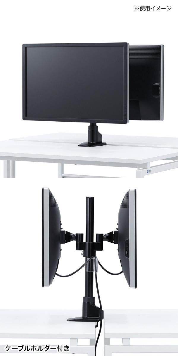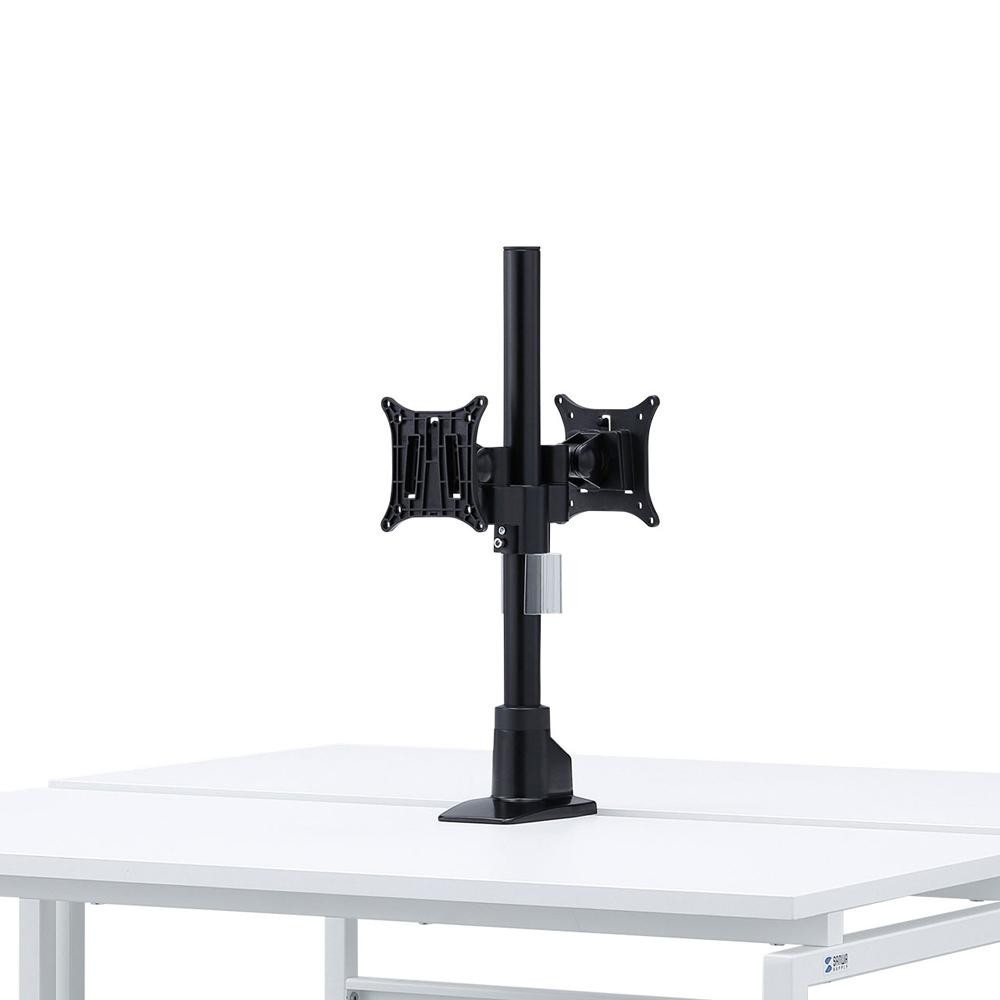 | 水平空間に対して全方向に自由に動かすことができ、高さは、支柱上で任意位置に固定することができます。ディスプレイの取り付けが前後になっており、向かい合わせにしたデスクなどで設置ができます。 |