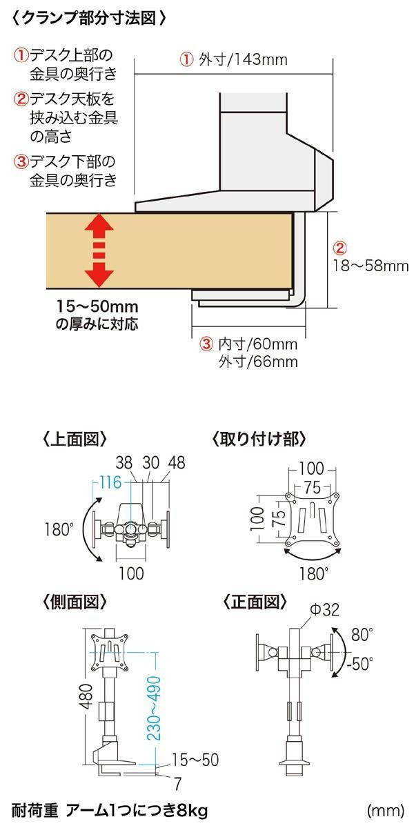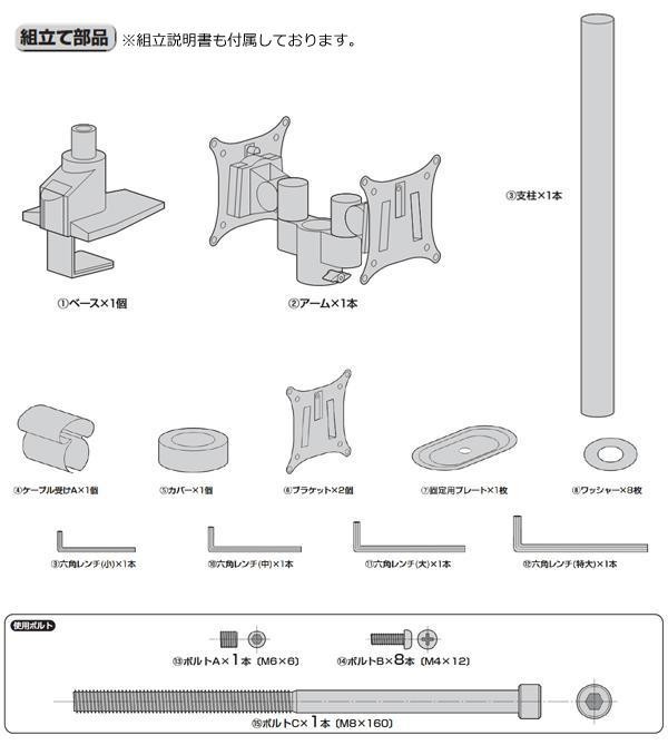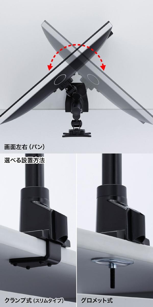 水平空間に対して全方向に自由に動かすことができ、高さは、支柱上で任意位置に固定することができます。ディスプレイの取り付けが前後になっており、向かい合わせにしたデスクなどで設置ができます。 |