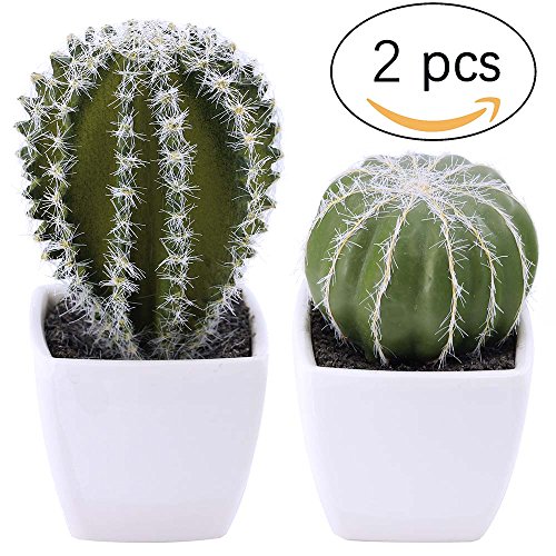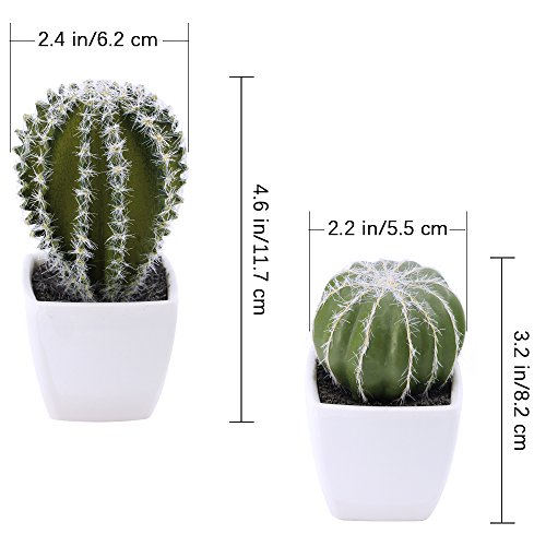 A set of 2 artificial cactus plants housed in white plastic pots.