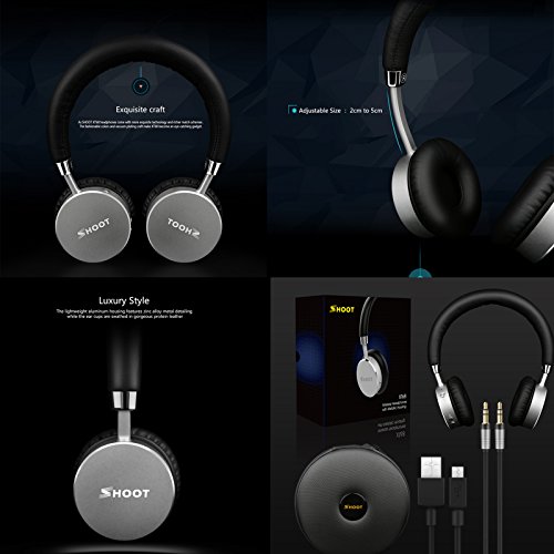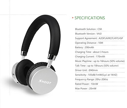 -. Binding : Electronics -. Brand : SHOOT -. Color : Silver -. Feature : 【PREMIUM 4.0 STEREO DRIVERS】 Adopted advanced Bluetooth 4.0 technology. The two high-end drivers crank out powerful, thumping bass, prominent mids and truly sparkling highs. The driver units measure in at Ø40mm and feature an impressive frequency range of 20hz-20khz. / 【16 HOURS MUSIC PLAY TIME/18 HOURS TALK TIME】40-mm drivers,105dB Sensitivity and built-in HD microphone deliver rich, deep bass and stream crystal clear sound while listening to music and making phone calls / 【STAY COMFORTABLE】The Memory-protein ear cushion simulate human skin texture, ensuring lasting comfort. The stainless steel slider(Adjustable Size:2cm-5cm) and softly padded headband allows you to find the perfect fit without constraint and provide excellent durability. / 【WIRELESS & WIRED MODE】 the wireless mode----With a built-in 290mAh battery which provides 16 hours' continuous wireless music play time and let you get rid of the tangled cables on the move; the wired mode----Used as a wired headphone with an audio cable. / 【NOTE】Depending on your head/ear size/shape, this headphones may be a little tight(feels like "on-ear") for someone which is designed to avoid sound leakage.In case of that and to get both audio and wearing comfort, please take off the headphone every 1-2 hrs to get your ears relax and protect them from lasting my environment in use. -. IsEligibleForTradeIn : 1 -. Label : SHOOT -. Manufacturer : SHOOT -. MPN : 404xt -. PartNumber : 404xt -. ProductGroup : Speakers -. ProductTypeName : HEADPHONES -. Publisher : SHOOT -. Studio : SHOOT -. Title : SHOOT Over Ear Bluetooth Headphones Headset Stereo Wireless Built-in Mic with Soft Memory-Protein Earmuffs for iPhone Samsung, LG, iPad