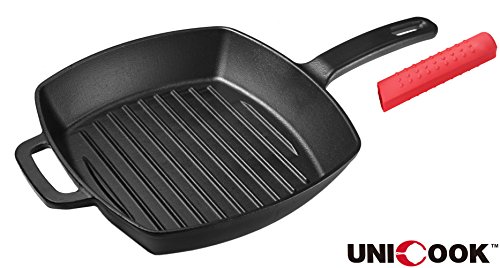-. Brand : UNICOOK -. Color : Black -. EAN : 0713179825595 -. Feature : Heavy weight cast iron construction / Superior heat retention and heat distribution / Ridged cooking surface for perfect sear marks / Oversized handles for easy lifting / Combo Pack square skillet and red silicone hot handle holder -. PackageQuantity : 1 -. ProductGroup : Kitchen -. ProductTypeName : KITCHEN -. Title : Unicook Pre-Seasoned Cast Iron Square Skillet,10.25-inch (bonus of heat resistant hot handle holder) -. UPC : 713179825595