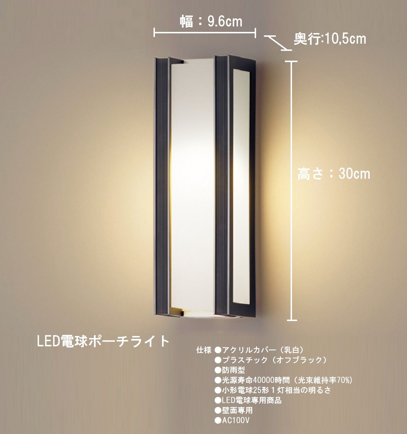 ● Acrylic cover (milky white) ● Plastic (off-bar rack) ● Rainproof type ● Light source life 40,000 hours (luminous flux maintenance factor 70%) ● Small bulb 25 type 1 equivalent of brightness ● LED bulb exclusive items ● wall only ● AC 100V ● slide